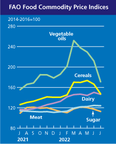 유엔 식량농업기구(이하 FAO)에 따르면, 2022년 7월 세계식량가격지수는 전월(154.3포인트) 대비 8.6% 하락한 140.9포인트를 기록하였다. 5개 품목군의 가격이 모두 하락하면서 2008년 10월 이후 가장 큰 하락 폭을 기록하였으며, 특히 곡물과 유지류 가격이 큰 폭으로 하락하였다.