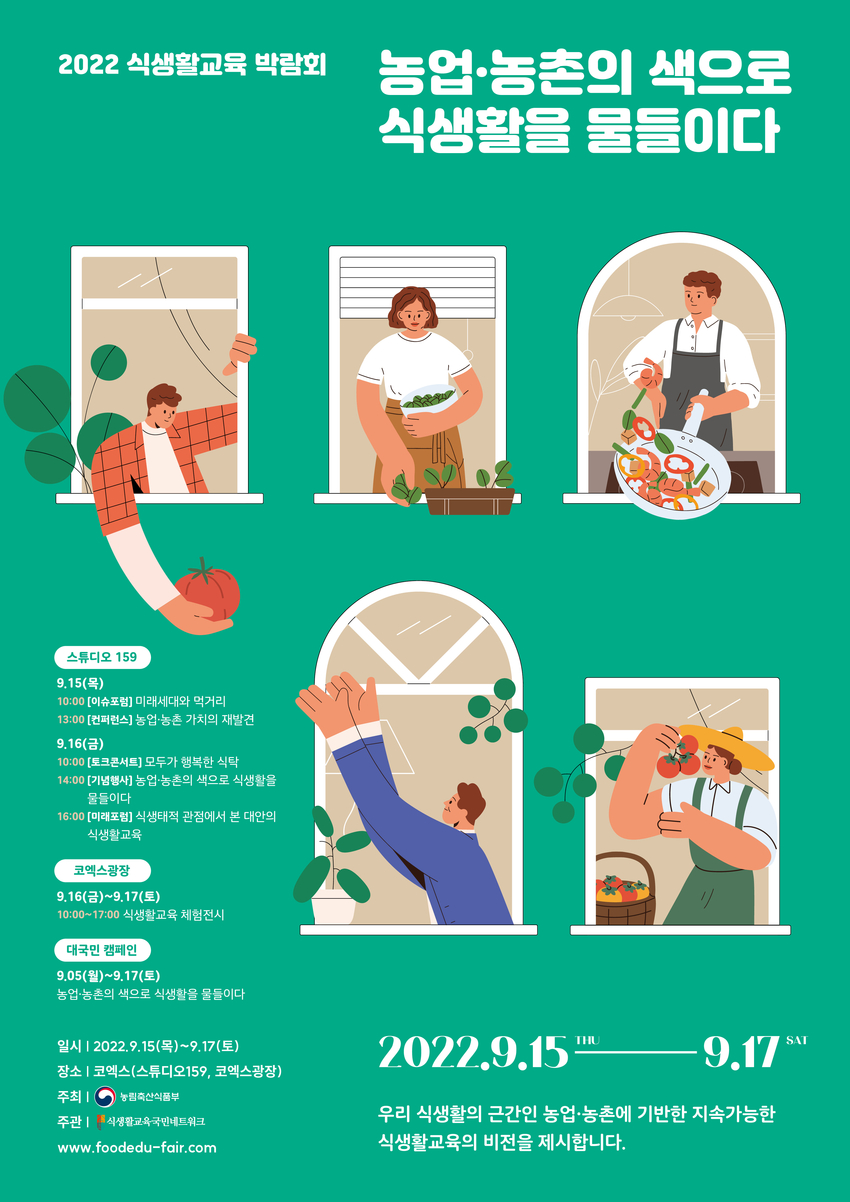 농림축산식품부는 식생활교육 주간 (9.11주간)을 맞이하여 오는 9월15일부터 17일까지 3일간 ‘2022 식생활교육 박람회 (이하 박람회)’를 개최한다.