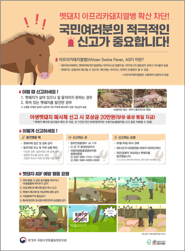 아울러, 축산관계자와 귀성객들을 대상으로 방역수칙과 협조사항도 적극 교육·홍보하고 있다. 문자메시지(SMS) 발송, 동영상 배포 등을 통해 축산관계자들에게 농장출입 차량 세척 철저, 농장 내부 출입 시 신발소독 등의 방역수칙을 안내하고 있다. 매일 마을방송 송출, 전국 터미널·기차역 등에 현수막 1,119개 게시 등을 통해 귀성객·성묘객 등을 대상으로 ①축산농장 방문 자제, ②성묘 후 남은음식물 등 모두 수거, ③야생멧돼지 폐사체 신고요령 등 방역수칙과 유의사항을 집중적으로 홍보하고 있다.