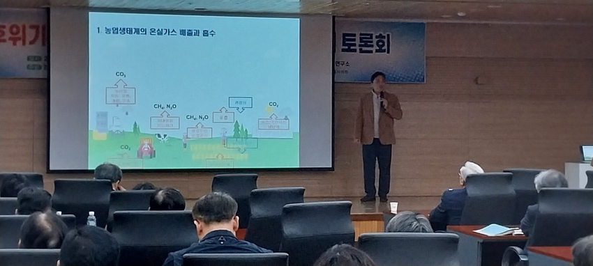 이길재 한국 농업 기술 진흥원 기후 변화 대응팀장은 주제 발표에서 ‘ 농업인 온실가스 감축 참여 방안’을 소개했다. 이 팀장은 " 온실가스 감축 사업은 저탄소 농업 기술을 도입하여 온실가스를 감축하고, 저장된 감축 사업으로 등록하여 (자발적 감축, 배출권 거래 등) 인 센 티 브를 취득하거나 배출권 거래 시장에 판매하여 소득을 창출하는 사업이다” 며 “ 농업인이 온실가스 감축사업 등록을 통해 감축량을 인증받으면 1톤당 CO2-eq 당 1만원 인센티브 지급하고 있지만 가격에 메리트가 없어 앞으로 환경도 살리고 온실가스 감축도 실현하는 탄소중립프로그램으로 전환 중이다”고 밝혔다.