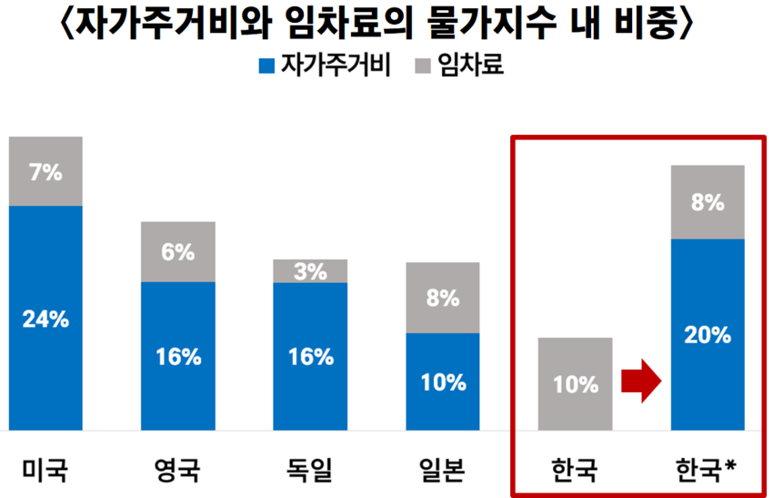 하지만 자가주거비와 임차료를 합한 총 주거비의 가중치를 해당 국가 간 비교했을 때, 한국의 자가주거비 비중은 20%에 이르며, 영국의 16%, 독일의 16%, 일본의 10%보다 높은 수준의 가중치를 가지는 것으로 나타났다.