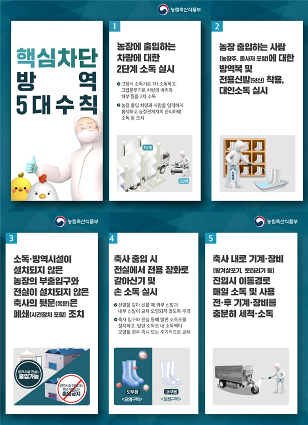 농식품부 최정록 방역정책국장은 “ 새로운 유형의 고병원성 조류인플루엔자가 확인된 만큼 확산 방지 및 피해 최소화를 위해 가금류 농장 종사자는 사육 중인 가금에서 폐사 증가, 산란율 저하 등 주요 의심증상 뿐만 아니라 경미한 증상이 확인되어도 즉시 방역 당국으로 신고해 달라”고 당부했다.