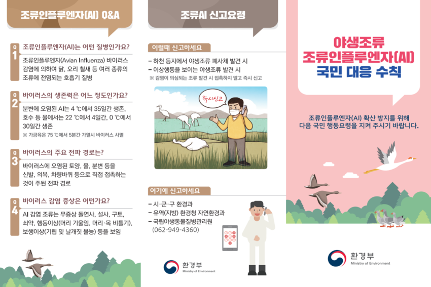 환경부는 자연보전국장 주재로 10월 18일 국립야생동물질병관리원, 국립생물자원관, 유역(지방)환경청이 참여하는 ‘야생조류 대응상황 점검회의’를 개최하여, 기관별 예찰 추진상황과 철새 이동현황 모니터링 현황 등을 점검했다.