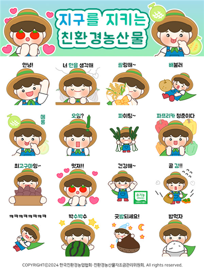 3년째 카카오톡 이모티콘 배포를 하고 있는 친환경농산물자조금관리위원회(위원장 유장수, 이하 친환경자조금) 는 지구를 지키는 농부의 자긍심 고취 및 찬환경농산물 소비를 위해 다양한 활동을 하고 있다. 이번 카카오톡 브랜드 이모티콘은 우리의 건강과 지구를 지키는 친환경농산물을 홍보하기 위해 제작되었다.