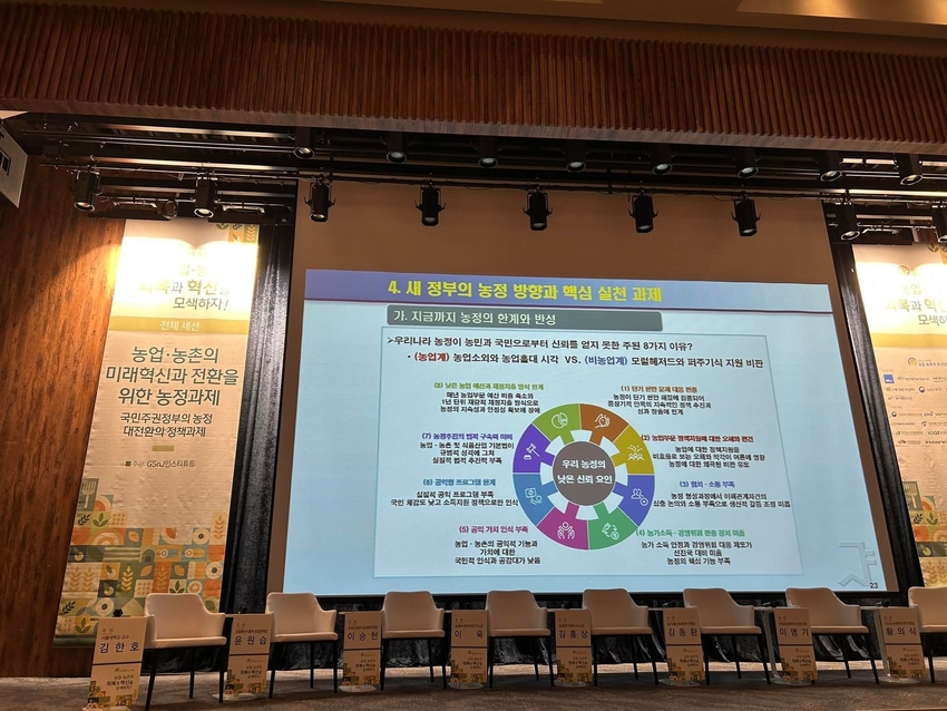 이명기 한국농촌경제연구원 선임연구위원은 농업의 성장 발전을 이끌 주체에 대한 인식, 즉 전문농가의 육성, 농업 자원환경대책 강화 등을 언급했으며, 황의식 GS&J 농정혁신연구 원장은 농지 소유와 이용에 대한 제도 개선,세재 및 재정지출 등을 강조했다.