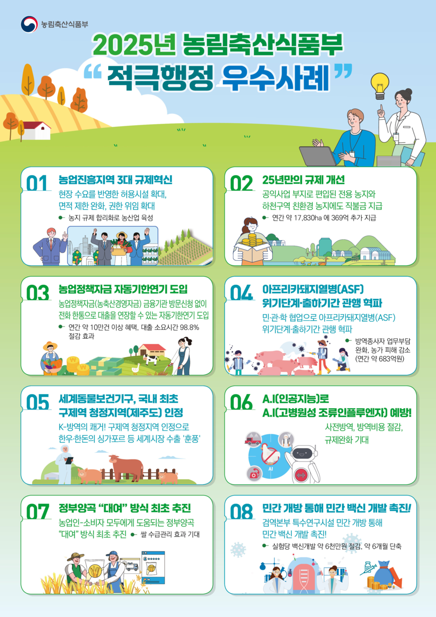 세부 과제로는 △‘농업진흥지역 3대 규제혁신’(농지과), △‘AI(인공지능)로 AI(고병원성 조류인플루엔자) 예방’(조류인플루엔자방역과), △‘농업인 대출기한 자동연기’(농업금융정책과) 등이 대표적인 사례이다.