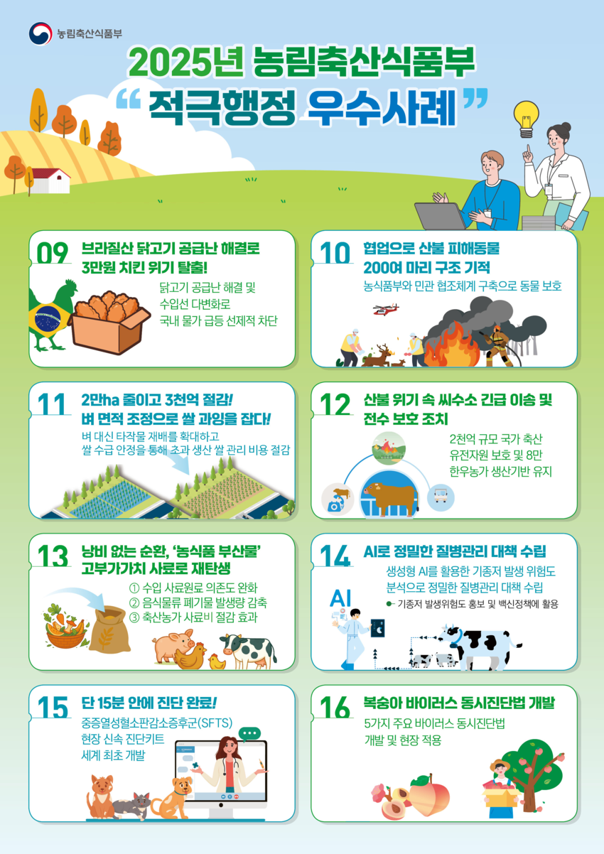 농림축산식품부(장관 송미령, 이하 농식품부)는 국민 편익 증진 및 규제 개선을 위한 공무원의 창의적 업무 수행 지원 등 새정부의 적극행정 실천 취지에 맞게, 적극행정 사례를 폭넓게 발굴 · 확산 중이며, 경진대회도 개최하여 16건의 우수사례를 선정했다.