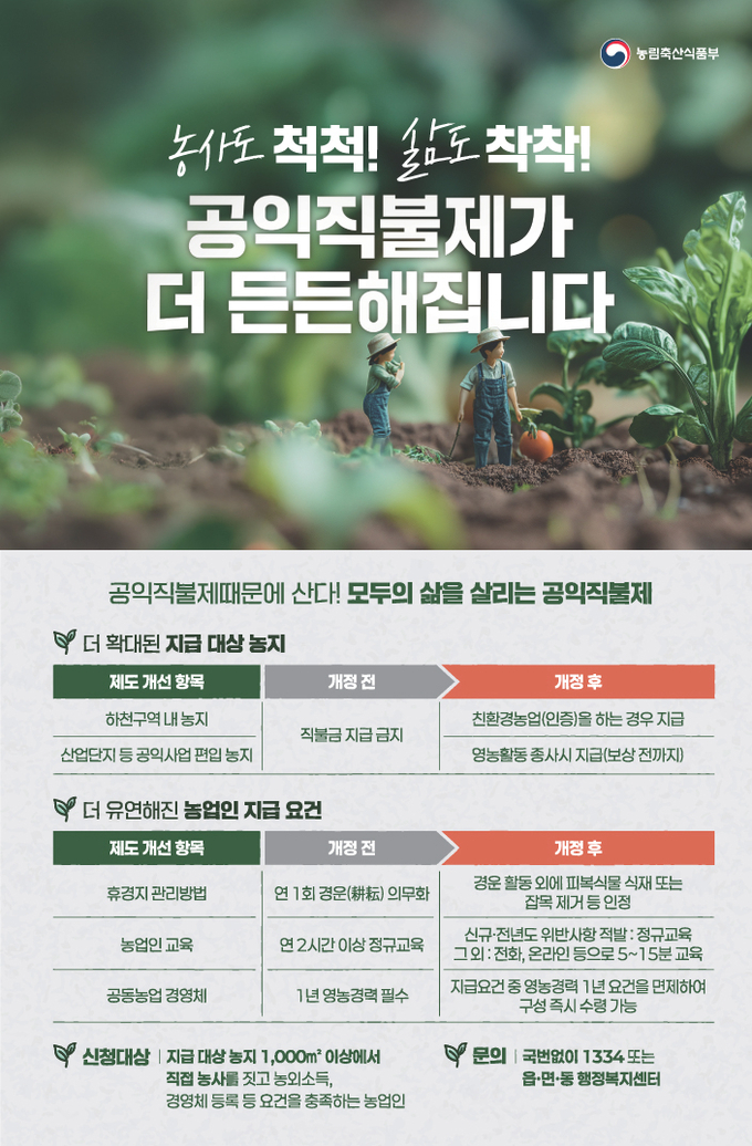 한편, 제도 사각지대에 놓여있던 △하천구역 내 친환경인증 농지, △국가 공익사업 수용 농지에 대한 규제를 완화하여 올해부터 공익직불제 제도 취지에 부합하는 농업인이 직불금을 받을 수 있도록 정책 효능감을 제고한 바 있다.