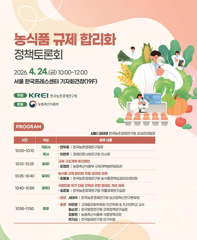 서대석 KREI 농산업혁신연구본부장이 좌장을 맡마 진행하는 종합토론에는 이민창 조선대학교 교수(규제합리화위원회 민간위원), 원소연 한국행정연구원 규제정책연구실장, 김동현 농림축산식품부 식량정책과장, 박기선 한국법제연구원 연구위원이 참여한다. 참석자들은 농식품 규제 합리화의 정책적 방향과 식량안보 강화를 위한 법·제도 개선 과제를 논의할 예정이다.
