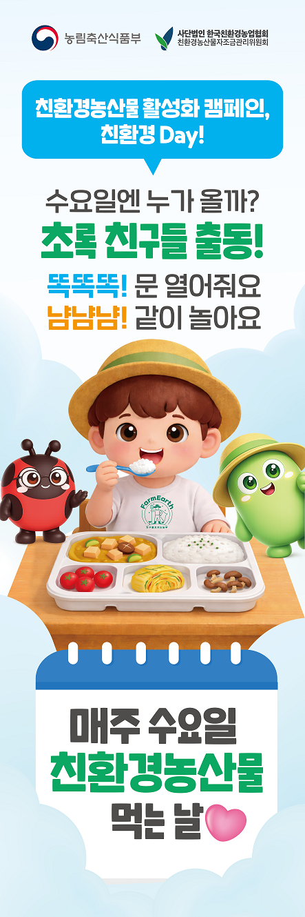 이재명 정부의 국정과제 ‘친환경농업 2배 확대’ 및 「제6차 5개년계획(26~’30)」의 차질 없는 수행을 위한 공공부문의 선도적 역할 강화를 위해 오는 4월 29일(수) 부터 「친환경농산물 소비 활성화를 위한 친환경 Day」캠페인이 본격 시작된다.