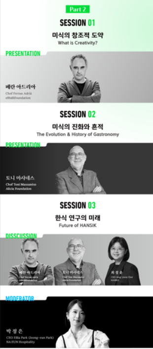 2부에서는 한식의 창의적 발전과 연구·교육 인프라 구축을 주제로 진행되며, ‘④미식의 창조적 도약’ 세션에서 페란 아드리아(Ferran Adrià)는 엘불리(El Bulli) 재단의 연구를 중심으로 창의성과 학문적 접근의 중요성을 공유할 예정이다.