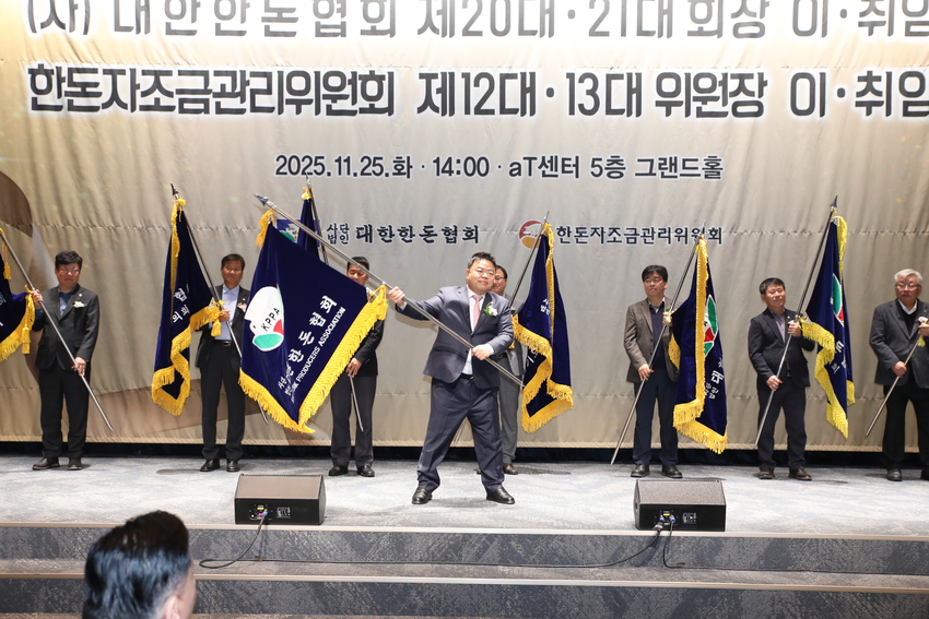 취임식에서는 전국 9개 도협의회를 상징하는 협회기 전수식이 진행됐다. 한돈산업의 화합과 발전을 상징하는 이 순간, 참석자들은 큰 박수로 새로운 출발을 축하했다.