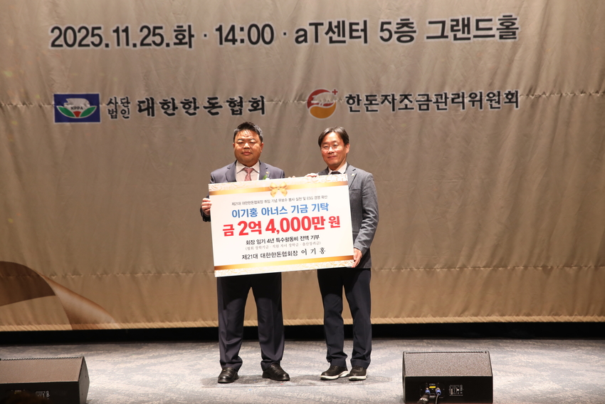 (사) 대한한돈협회 (회장 이기홍)는 지난 11월 25일 서울 서초구 aT센터 5층 그랜드볼륨홀에서 '대한한돈협회 제20·21대 회장 이·취임식'을 개최했다. '한돈자조금관리위원회 제12 · 13대 위원장 이 · 취임식'도 겸한 이날 행사는 전날 충남 당진에서 발생한 ASF 의심 신고와 48시간 스탠드스틸(일시이동중지) 조치에 따라 당초 계획보다 대폭 축소되어 임원 및 외빈 중심으로 진행됐다. 협회는 회원 농가의 안전을 최우선으로 고려해 일반 농가의 방문을 자제토록 요청하고, 행사장 방역 조치를 대폭 강화해 만전을 기했다.