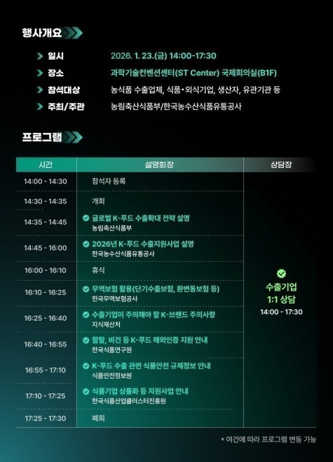 농림축산식품부(장관 송미령, 이하 농식품부)는 K-푸드의 글로벌 진출 확대를 위해 전년보다 900억원 증가한 7,070억원 규모의 2026년 K-푸드 수출지원사업 설명회를 1월23일(금) 서울 과학기술컨벤션센터에서 개최한다고 밝혔다.