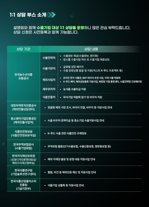 또한, 지식재산처, 대한무역투자진흥공사, 중소벤처기업진흥공단, 식품안전정보원, 한국무역보험공사, 한국지식재산보호원, 한국식품연구원, 한국식품산업클러스터진흥원 등 관계 부처와 유관 기관은 K-푸드 수출 확대를 위한 무역보험, K-브랜드 보호, 해외 인증, 수출 상품화 등 수출 관련 필수 정보 및 지원사업 등을 설명할 예정이다.