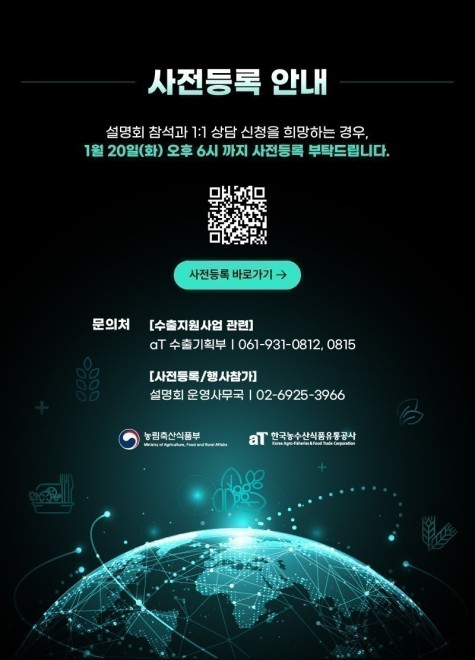 설명회 참석을 희망하는 수출 관계자는 한국농수산식품유통공사 홈페이지(https://www.at.or.kr), 수출종합지원시스템(https://global.at.or.kr), KATI 농식품수출정보(https://www.kati.net)를 통해 온라인으로 신청 가능하며, 온라인 생중계도 병행할 계획이다.