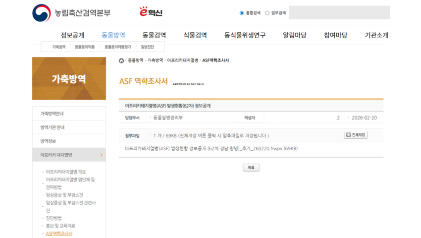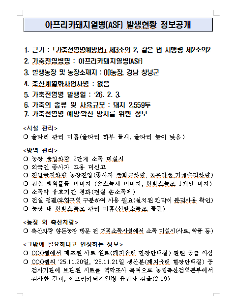 아프리카돼지열병 중앙사고수습본부(본부장 송미령 농림축산식품부장관, 이하 중수본)는 2월 20일(금) 아프리카돼지열병(ASF) 발생 상황, 역학조사 결과를 확인하고 확산 방지를 위한 방역 대책을 추진한다.