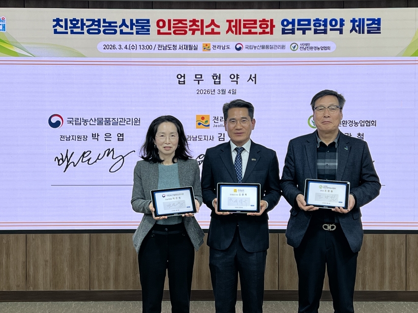 전라남도는 4일 도청 정약용실에서 국립농산물품질관리원 전남지원, (사)전남친환경농업협회와 함께 ‘친환경농산물 인증취소 제로화’를 위한 업무협약을 했다.