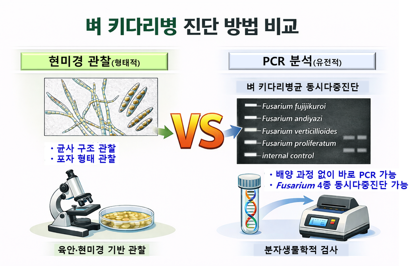 벼 키다리병은 Fusarium 속 곰팡이에 의한 대표적인 종자전염성 병해로, 감염된 종자는 발아 불량, 도복, 생육 저하 및 수량 감소 등 큰 피해를 준다. 기존에는 병원균을 직접 배양해 현미경으로 형태를 관찰하는 방법을 사용해 왔다. 그러나, 이 방법은 병원균의 정확한 구별이 어렵고 검사자의 숙련도에 의존하며, 시간과 노동력이 많이 소요되는 한계가 있었다.