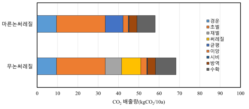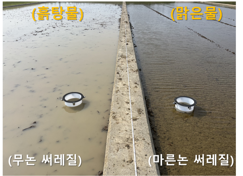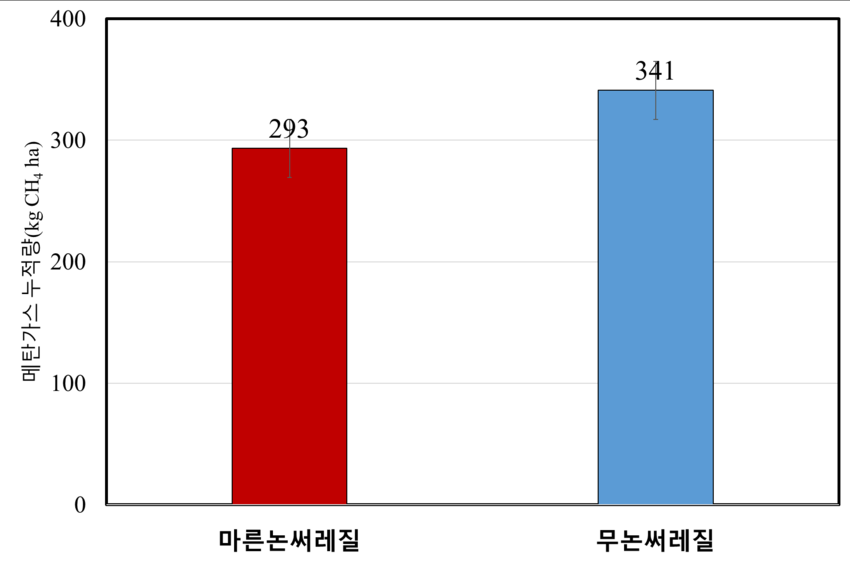 먼저 ‘벼 마른논 써레질’은 논에 물을 채우지 않은 마른 상태에서 흙을 부수고(로터리) 고르는(평탄) 작업 뒤 모내기 직전 물을 대는 방식이다. 논에 물을 댄 상태에서 농기계를 반복 운행하는 기존의 ‘무논 써레질’에 비해 농기계 이산화탄소 발생량 ((무논 써레질) 68.27 (마른논 써레질) 58.02 (17.7%↓))은 17.7%, 토양 내 메탄 배출량 ( (무논 써레질) 341 (마른논 써레질) 293 (14.0%↓))은 14.0% 줄일 수 있다. 게다가 흙탕물 유출을 방지해 하천 생태계 보호 효과도 크다.