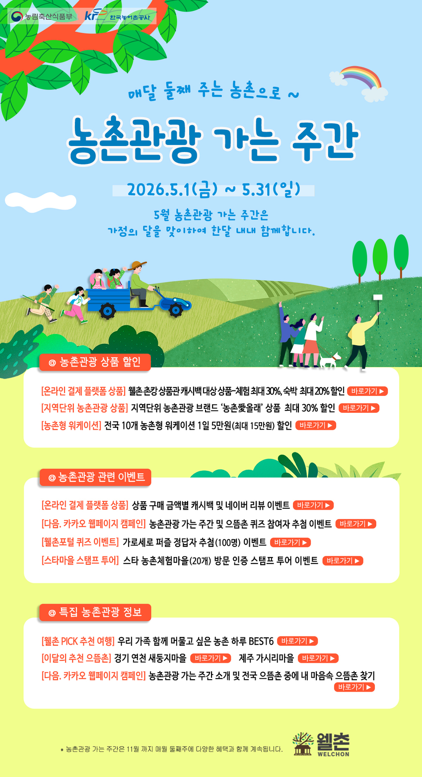 또한, 농촌관광 포털 ‘웰촌’을 통해 5월 추천 여행지와 이달의 으뜸촌 등에 대한 정보도 지속적으로 제공 할 예정이다.