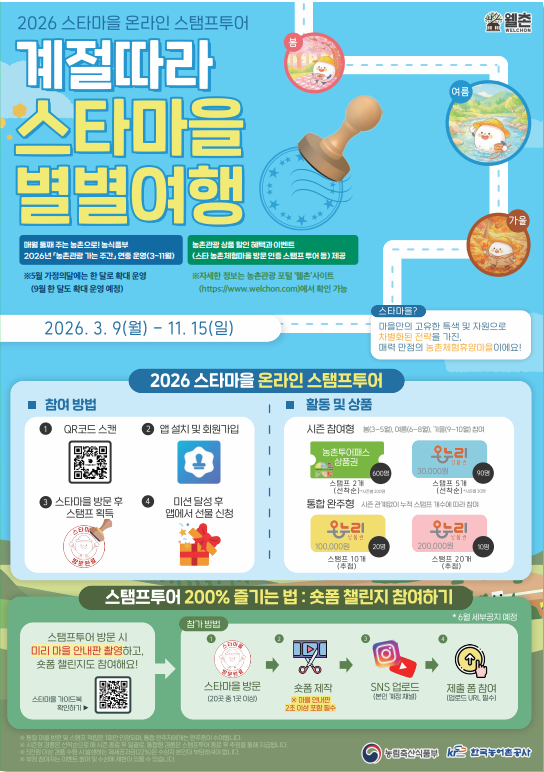 아울러, 전국 20개 스타 농촌체험 마을 스탬프 투어 이벤트를 계속 진행하고, 먼저 3~5월 봄 시즌 방문객에 대해서는 인증 횟수에 따라 농촌투어패스 상품권과 온누리상품권을 제공(선착순)할 계획이다. 또한, 온라인 결제 플랫폼을 통한 농촌관광 상품 구매 시 캐시백 및 리뷰 이벤트 등도 계속 운영할 예정이다.