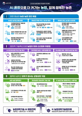 농림축산식품부 (장관 송미령, 이하 농식품부)는 12월 10일(수)부터 11일(목) 양일간 서울 양재 aT센터에서 「2025 농림축산식품 과학기술대전」(이하 과학기술대전)을 개최했다고 밝혔다. 과학기술대전은 2004년부터 격년으로 개최하여 올해로 11회째를 맞는다. 올해 과학기술대전은 ‘미래농업, 내일을 열다’라는 주제로 AI(인공지능) 농업혁신, 대체식품, 리버스에이징 (생애주기 맞춤형 식품 설계, 노화억제 식품 등 건강수명 100세 시대 구현할 수 있는 기술 전시), 디지털육종, 극한환경농업, 애니멀 웰케어 등 6개 분야에 110여개 기관의 농식품 연구개발 성과 및 혁신적 기술·제품을 전시하여 다양한 최신 농업분야 과학기술을 접할 수 있도록 준비했다. 글로벌·혁신존에는 2026년 CES(Consumer Electronics Show, 소비자 가전 전시회) 혁신상을 수상한 선도기업 ( ㈜새팜 : 인공위성 영상·기상정보 기반의 필지별 작황 모니터링 구독형 서비스터빈크루 : 무선충전 스테이션 기반 드론 활용 농작물(양배추, 고구마 등) 생육 예측시스템)들이 포함되어 있어 내년 개최 예정인 CES 전시기업의 성과를 사전에 직접 확인할 수 있었다. 또한 ‘수직농장