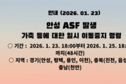 아프리카돼지열병 중앙사고수습본부 (본부장 송미령 농림축산식품부장관, 이하 중수본)는 1월 23일(금) 경기도 안성시 소재 돼지 농장 (2,600마리 사육)에서 아프리카돼지열병이 확진됨에 따라, 같은 날 관계부처와 지방정부가 참여하는 중수본 회의를 개최하고 발생 상황과 방역 대책을 점검했다. 이번 발생은 오늘 1월 23일(금) 오전, 돼지 폐사 사실을 확인한 농장관리자가 안성시에 신고함에 따라 정밀검사를 실시한 결과 아프리카돼지열병 양성이 최종 확인됐다. 이는 올해 두 번째 발생한 사례이며, 안성시에서는 과거 농장 및 야생멧돼지에서 아프리카돼지열병 발생 이력이 없었다. ‘25/26년 농장 발생 8건은 경기 ① 양주(1.20, 50차), ② 양주(1.28, 51차), ③ 양주(3.16, 52차), ④ 파주(7.16, 53차), ⑤연천(9.14, 54차), 충남 ⑥ 당진(11.24, 55차), 강원 ⑦ 강릉(1.16, 56차), 경기 ⑧ 안성(1.23, 57차) 등이다. 중수본은 이에 따라 경기도 안성시 소재 돼지농장에서 아프리카돼지열병이 확진됨에 따라 즉시 초동방역팀 및 역학조사반을 현장에 파견하여 외부인·차량의 농장 출입 통제하고, 추가확산 방지를 위해 발생농