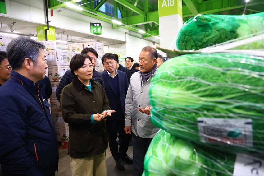 송미령 농림축산식품부 장관은 11월 12일 (수) 밤 9시경 서울시 송파구에 소재한 가락시장을 방문하여 배추, 무, 대파 등 주요 김장재료의 출하 상황과 도매가격 등을 점검했다. 아울러, 도매법인 및 중도매인 등에게 농산물 유통구조 개선 대책이 조기에 성과를 나타낼 수 있도록 협조를 당부했다.