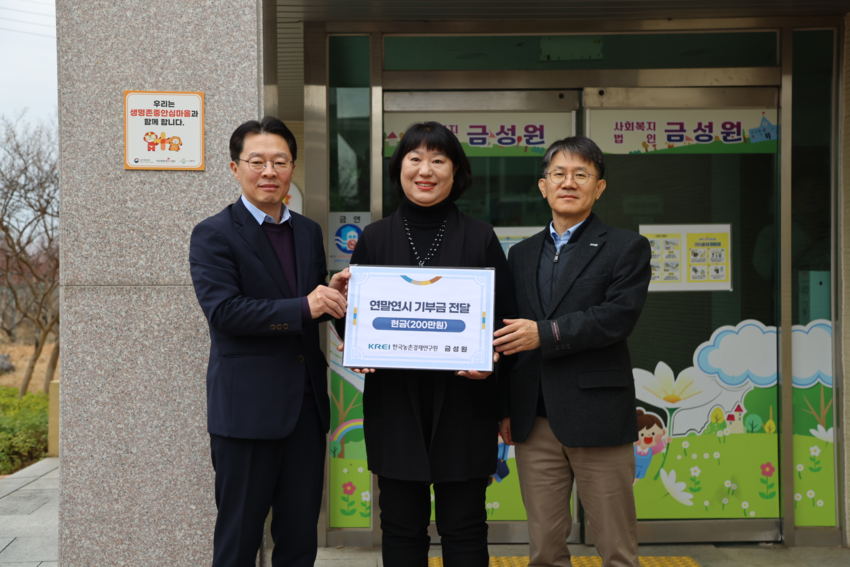 한국농촌경제연구원(원장 한두봉)은 12월 16일 연말을 맞아 지역 복지시설인 아동복지시설 금성원과 사회복지시설 부활의 집을 방문해, 직원들이 함께 모은 후원금을 전달했다.