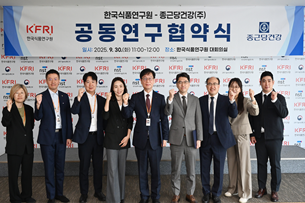 한국식품연구원 (원장 백현동, 이하 ‘식품연’)은 9월 30일 종근당건강 ㈜ (대표 정수철)과 ‘장 불편감 완화 차세대 프로바이오틱스(NGP) 소재 개발’ 공동연구 협약을 체결했다고 밝혔다.