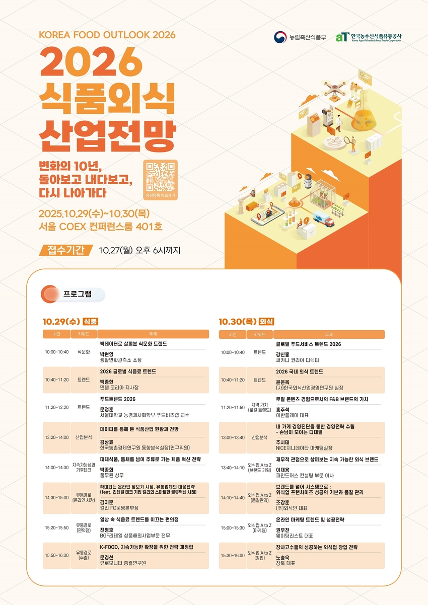 참가 신청은 10월 27일 오후 6시까지 ‘2026 식품외식산업 전망’ 누리집(www.koreafoodoutlook.kr)을 통해 가능하며, 행사는 aT 공식 유튜브 채널에서 실시간 송출될 예정이다.