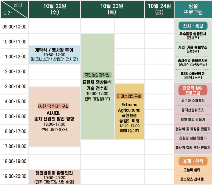 아울러 (사)한국종자연구회와 국립농업과학원 등에서는 학술 행사를 진행하는 등 박람회와 연계하여 다양한 행사가 추진된다.