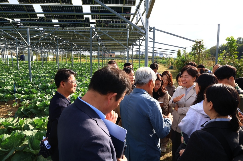 송미령 농림축산식품부 (이하 농식품부) 장관은 2025년 10월 22일(수) 오후 청주시 오창읍 ‘ 영농형 태양광 실증단지’를 방문하여, 영농형태양광 하부에 심긴 양배추 작물 재배 현장을 시찰하고 현장에서 지역농업인, 태양광 관련 기업들과의 간담회를 통해 애로사항을 청취했다.