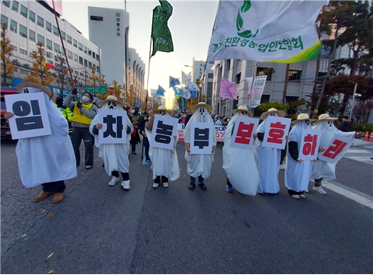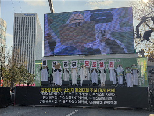 특히, 유령농부 복장을 하고 친환경 임차농부의 피해를 고발한 퍼포먼스는 “ 친환경 임차농 피해를 방관하는 농식품부를 규탄한다”며, " 실제 경작자인 친환경농부의 인증취소와 농지 이탈을 야기하는 불공정한 현실을 지적하고 정부의 책임있는 대책마련 등을" 촉구했다.