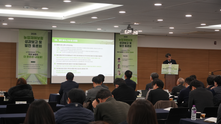 농업정책보험금융원(원장 서해동, 이하 농금원)은 12.5.(금), 서울 양재동 aT센터에서 농업인단체, 연구기관, 학계, 보험사 등 관계자 100여명이 참석한 가운데 「2025년 농업재해보험 성과보고 및 발전 토론회」를 성황리에 개최했다.