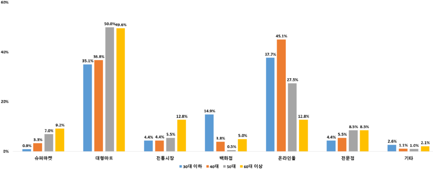 농식품 구매 장소로는 소비자의 절반 가까이가 대형마트(46.8%)를 꼽았고, 전통시장(15.6%), 온라인몰(14.2%)이 다음을 차지했다.