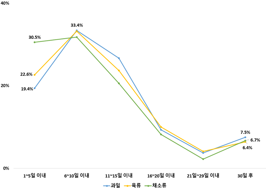 설 연휴 이후에는 잔여 음식 소비(63.3%), 건강 관리(17.6%) 등의 영향으로 농식품 구매가 일시 감소하지만, 명절 이후 6∼10일 이내에 농식품 구매가 회복되는 것으로 조사됐다.