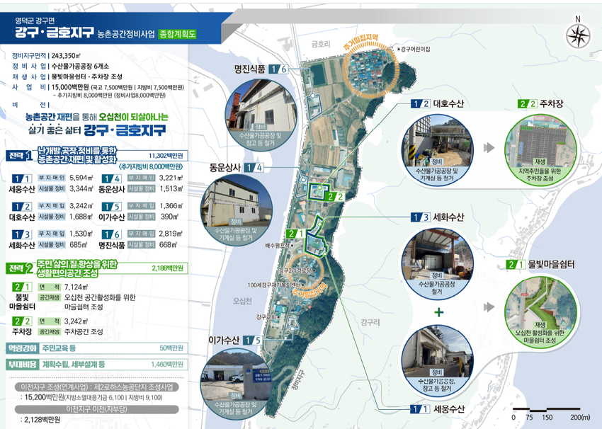 경북 영덕군(강구금호지구)은 주거밀집지역에 주거와 혼재되어 악취, 분진 및 소음 등으로 주민 삶의 질을 저해하고 있는 가공 공장을 인근 농공단지로 이전한다. 기존 시설이 있던 공간에 지역주민들을 위한 마을쉼터와 공동주차장 등을 조성하여 주거지와 공업지의 효과적인 공간 재배치를 실현할 계획이다.