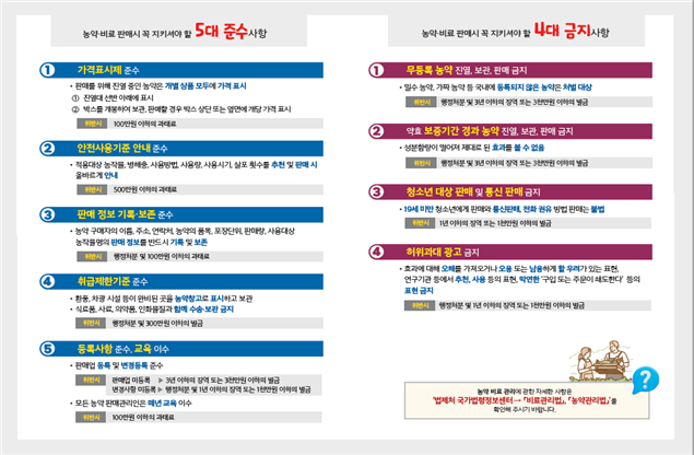 주요 위반사항 처분기준은 부정·불량 농약 판매 시(행정처분 및 3년 이하의 징역 또는 3,000만 원 이하의 벌금), 농약 취급제한기준 미준수 시(행정처분 및 300만 원 이하의 벌금), 가격표시제 미준수 시(100만 원 이하의 과태료 부과) 등이다.
