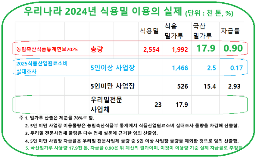 아래 표가 이와 관련한 중요 참고자료인데, 국내 밀 산업에서 가장 큰 소비는 라면 포함 국수부분이다. 이에 우리밀 국산밀 소비 확대는 단연 이 부분에 가장 역점을 두고 전개할 필요가 있음을 말한다. 시장 규모를 넘어서 기후 조건 등에서 우리밀 국산밀은 중력분으로, 국수용으로 손색없다는 평가를 듣고 있다는 점도 이와 관련해 중요 참고 사항이 된다.