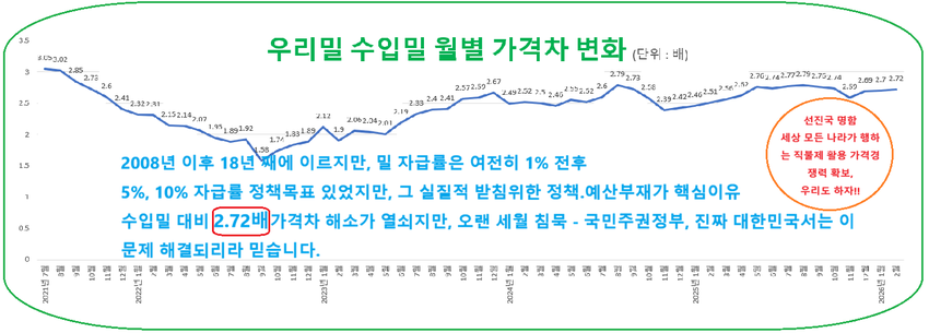 첫째, 원료곡 가격을 수입밀 수준으로 낮추고 그 차이를 직불 방식으로 보전하는 구조 전환이 검토되어야 한다.