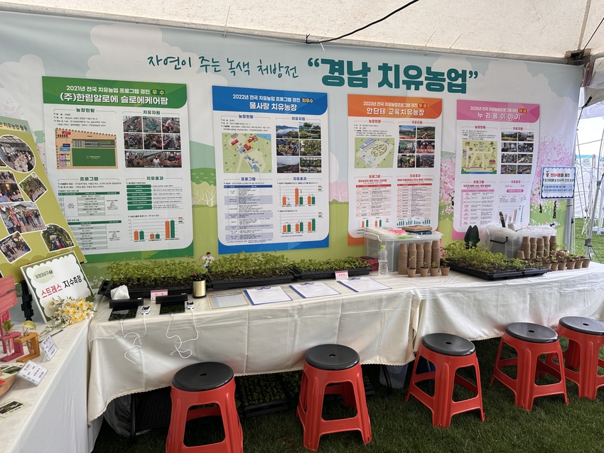 경남농업기술원은 행사 기간 ‘치유농업 체험‧전시관’을 조성해, 전시와 체험을 결합한 참여형 공간으로 운영했다. 전시관에는 치유농업 홍보자료와 경남 치유농장 소개 콘텐츠, 팜파티 포토존 등을 배치해 관람객이 자연스럽게 치유농업을 이해할 수 있도록 구성했다.