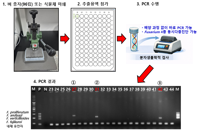 벼 키다리병은 Fusarium 속 곰팡이에 의한 대표적인 종자전염성 병해로, 감염된 종자는 발아 불량, 도복, 생육 저하 및 수량 감소 등 큰 피해를 준다. 기존에는 병원균을 직접 배양해 현미경으로 형태를 관찰하는 방법을 사용해 왔다. 그러나, 이 방법은 병원균의 정확한 구별이 어렵고 검사자의 숙련도에 의존하며, 시간과 노동력이 많이 소요되는 한계가 있었다.