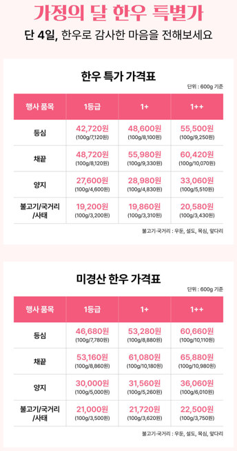 또한, 이번 할인행사에 참여한 업체별로 부위와 등급에 따라 할인가격은 상이하나, 정상가격과 비교하면 최대 50%까지 인하된 가격으로 판매된다.특히, 캠핑 등 야외할동이 많은 점을 고려하여 등심의 경우 설명절 할인행사(1등급 기준 100g당 7,870원)보다 약 9% 인하된 100g당 7,160원에 판매된다.