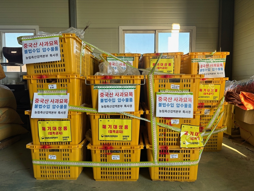 농림축산검역본부(본부장 최정록, 이하 ‘검역본부’)에 따르면 2026년 3월부터 4월까지 묘목·종자류 불법수입 차단 기획수사를 진행해 과수화상병 등 식물병해충 유입 차단을 위해 수입이 금지된 중국산 사과묘목 등을 적발했다고 밝혔다.