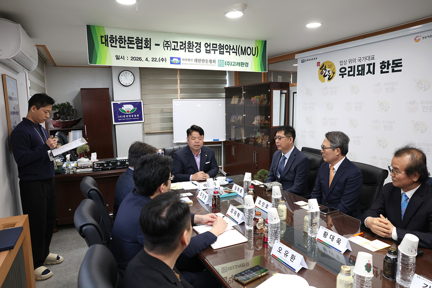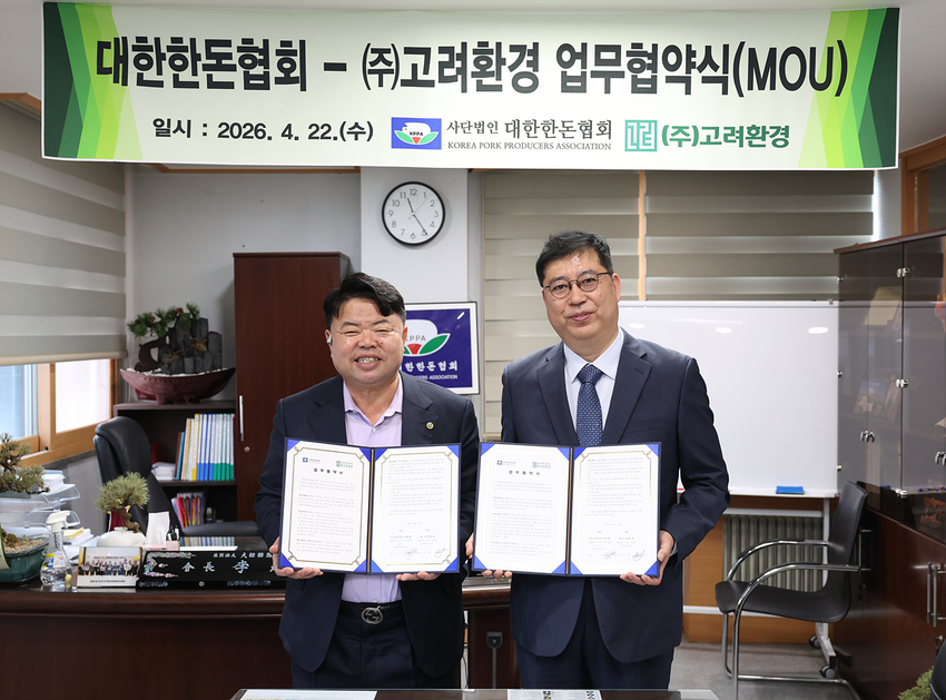 대한한돈협회 (이기홍 회장)는 4월 22일 제2축산회관에서 ㈜ 고려환경 (대표 임휘용)과 친환경 축산분뇨 처리 및 냄새저감 기술 개발 · 보급을 통한 한돈산업 환경경쟁력 강화를 위한 업무협약(MOU)을 체결했다.